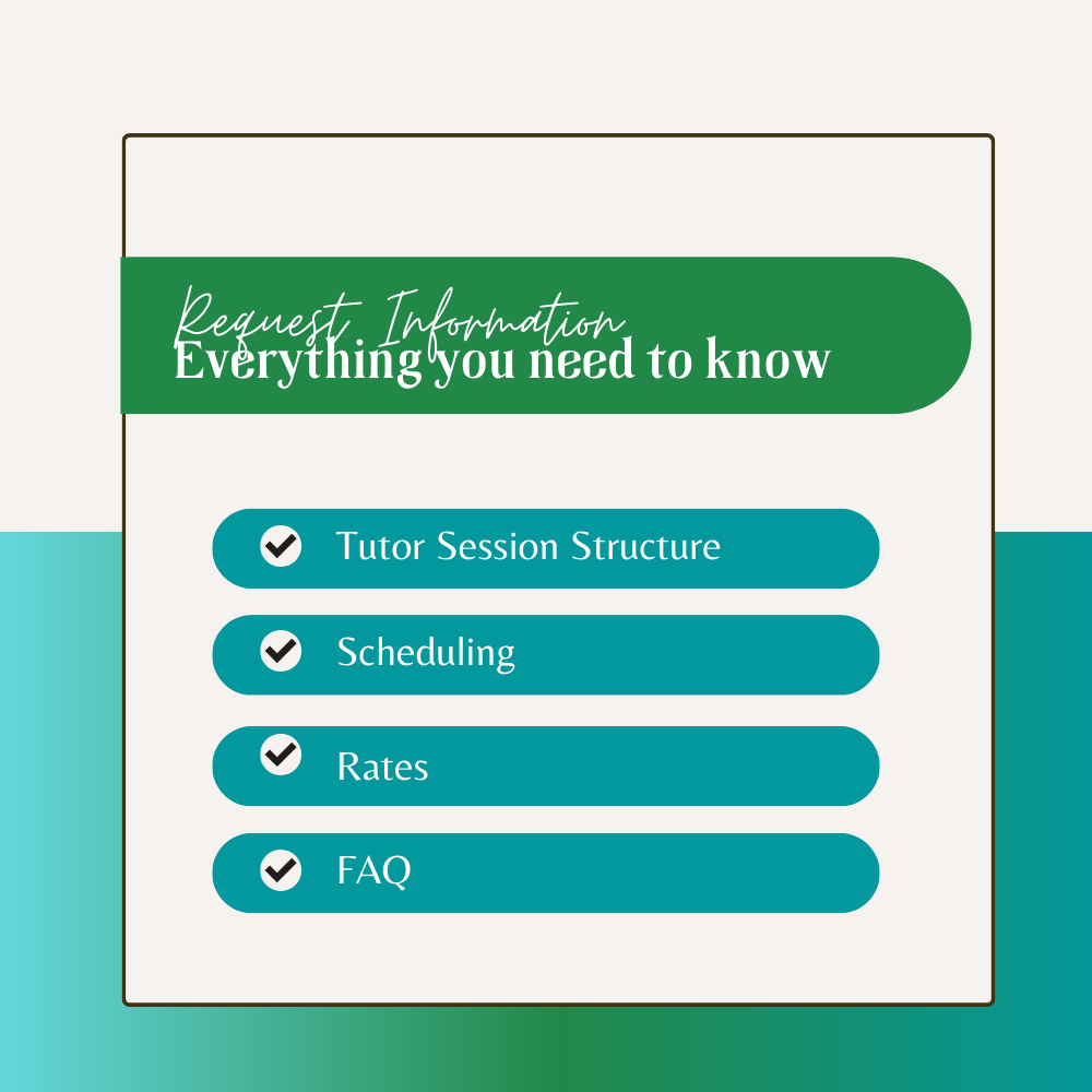Our tutors work with students right in the comfort of their homes, providing a quiet and familiar study environment. Each tutor is passionate about education and specializes in specific subjects. We keep parents informed about what’s covered in every session and provide workbooks when needed.