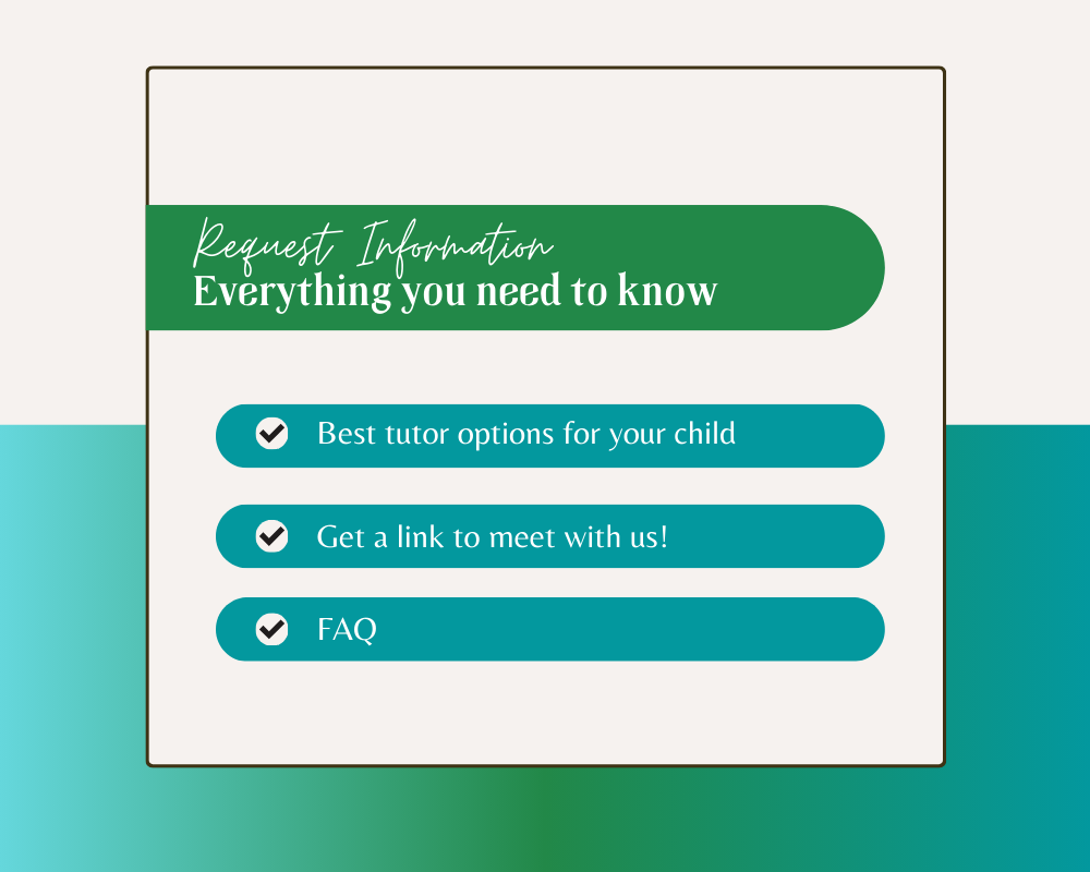 Our tutors work with students right in the comfort of their homes, providing a quiet and familiar study environment. Each tutor is passionate about education and specializes in specific subjects. We keep parents informed about what’s covered in every session and provide workbooks when needed.